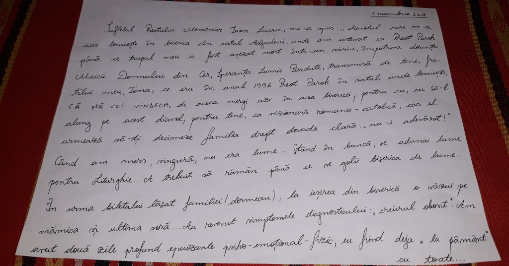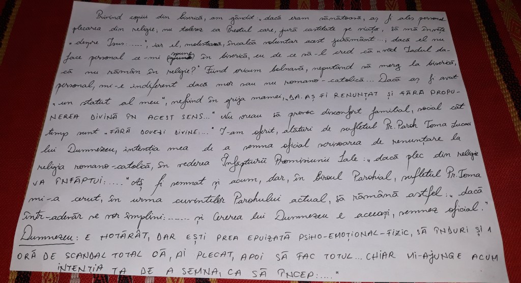 Looking at the children in the church I thought: “If I was healthy I would have chosen myself lo leave this religion; I do not tolerate that the Priest who swears chastity for life to teach me about Jesus… and he molests, violates voluntary this oath; if he does not do himself as he says to me in the church, why should I believe him that ‘I will go to Hell if I do not stay in this religion?’. Being anyway sick, not being able to go to the church, personally I am indifferent if I die or not roman-catholic… If I would have had a statute of my own, not being in the care of my mother, ‘YES. I WOULD HAVE GAVE UP EVEN WITHOUT THE DIVINE PROPOSAL IN THIS MATTER…’. I do not wish to create discomfort in my family, socially as long as I am ‘WITHOUT DIVINE PROOFS: ______’. I offered to God, alongside the soul of the Parish Priest Toma Lucaci, my intention to officially sign the letter of leaving the roman-catholic religion for the Enactments of His Promises: ‘If I leave the religion HE WILL ENACT: _______’. I would have signed even now, but, in the Parishes office, the soul of Priest Toma asked me, after the words of the current Parish, to remain this way: ‘If indeed all will come true: ______ and God’s Request is the same, I’ll sign officially”.