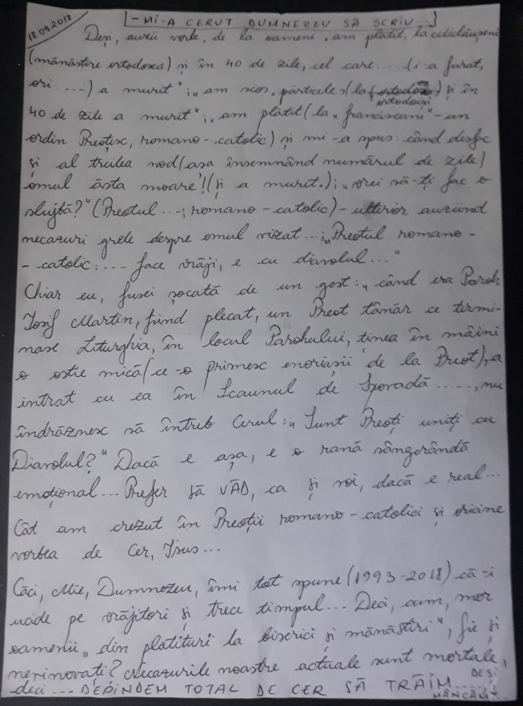 Although I’ve heard words from people: “I paid to Miclăușeni (an orthodox monastery) and in 40 days the one that: ______ (stole from him, or ______) died”; “I drew părticele (at the orthodox) and in 40 days he/she died”; “I paid (at Franciscans – a priest’s order, roman-catholic) and he told me: when I knot the fortieth node (this meaning the number of days, one node is made each day following a prayer) this man dies! (and he died.)”; “Do you want me to take you a mass?” (Priest ______, roman-catholic) – afterwards I’ve heard of great troubles about the man targeted); “The roman catholic Priest: ______ does witchcraft, he is with the devil…”