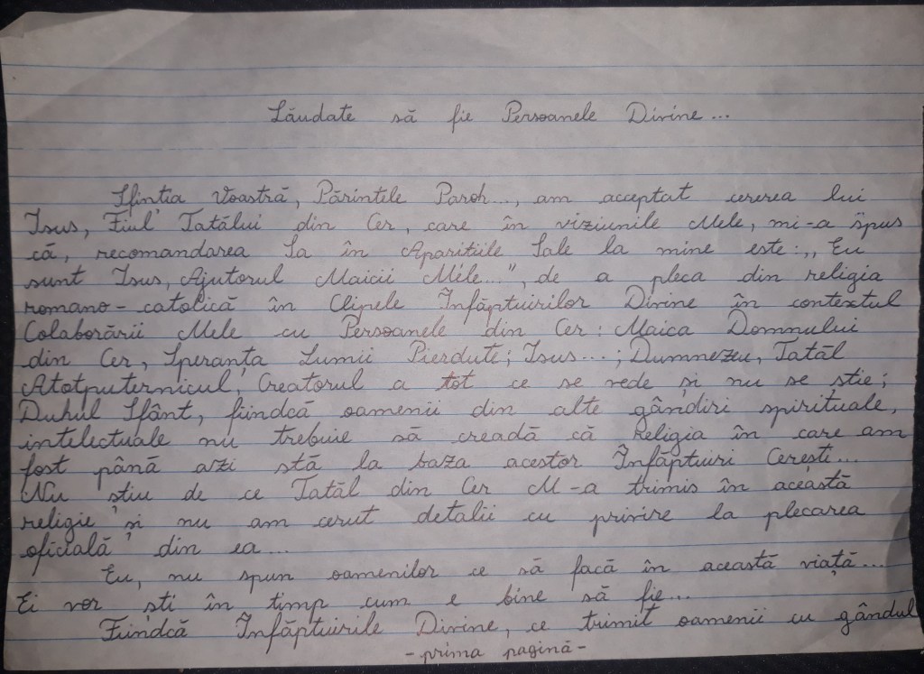 Your Holiness, Parish Priest… I accepted the request of Jesus, the Son of the Father from Heaven, that in My visions has said that His recommendation in His Appearances towards me is: “I am Jesus, My Mother’s Help…” of leaving the roman-catholic religion in the Moments of the Divine Enactments in the context of My Collaboration with the Persons from Heaven: The Mother of God from the Heaven, Hope of the Lost World; Jesus…; God, the Almighty Father, the Creator of everything that shows and it is not known; The Holy Spirit, because people from other intellectual, spiritual thoughts, must not believe that that the religion in which I was until today lies at the heart of this Heavenly Enactments… I do not know why the Father from Heaven sent Me in this religion and I never asked details regarding the official leaving from it…