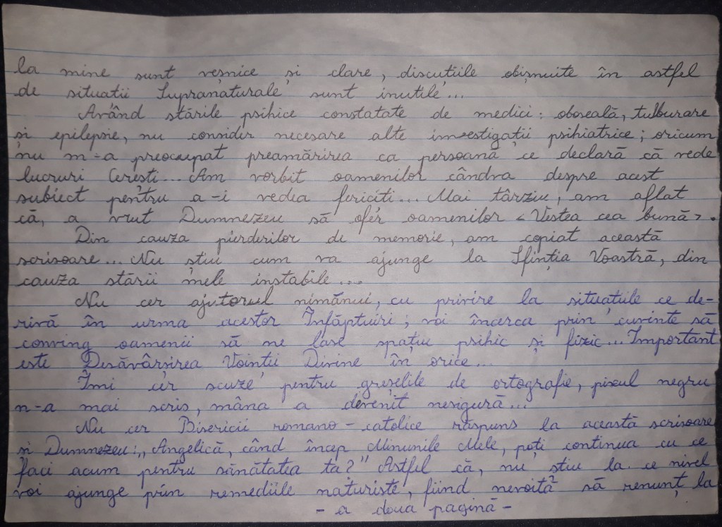 Having mental conditions identified by the doctors: tiredness, disorder and epilepsy, I do not consider other psychiatric investigations as necessary; I was not preoccupied by self-eulogy as a person that declares that sees Heavenly things anyway… I once spoken to humans about this subject in order to see the happy… Later, I found out that God wanted from me to offer to humans The Good News.