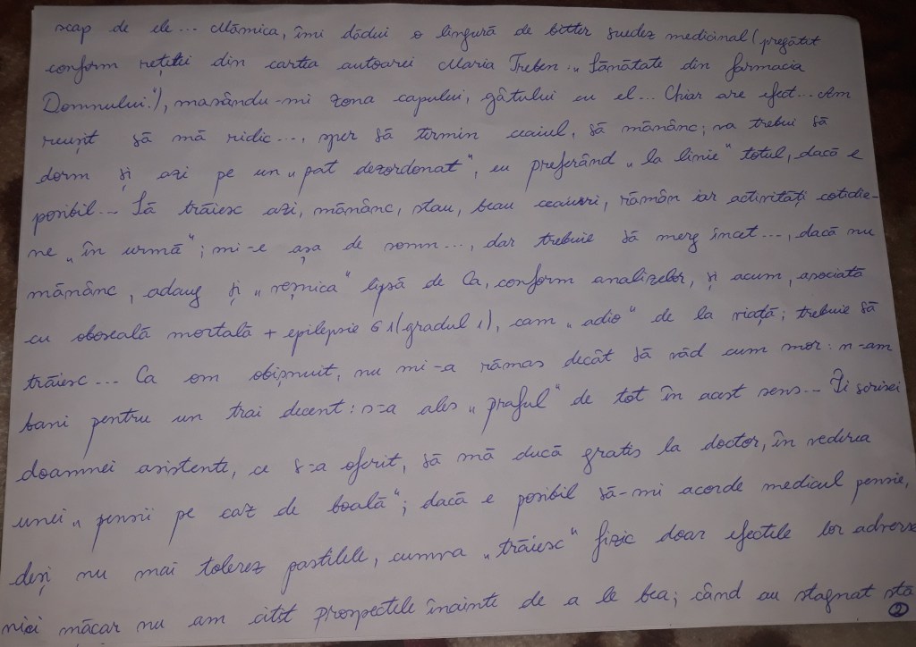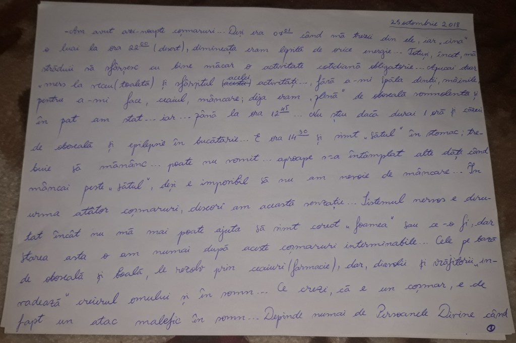 – I had nightmares last night… Although the clock was 07:01 when I woke up and I took dinner at 22:00 (desert), in the morning I lacked any kind of energy… Still, slowly, I strive to end at least one compulsory daily activity… I only got to go to the WC (toilet) and end it… without even getting to wash my teeth, hands, in order to do my tea, food; I was already full of somnolence, tiredness, and I stayed in bed again until 12:45… I do not know if it took one hour and I fell of tiredness and epilepsy in the kitchen… It’s 14:30 and I feel satiated in my stomach; I have to eat… maybe I will not throw up… it almost happened other times when I ate above satiated, although it is impossible not to need food… After all these nightmares, I often have this sensation… My nervous system is confused so it cannot help me to proper feel the hunger or whatever that might be, but in this state I get only after these endless nightmares… The ones given from tiredness and disease I handle through tea (pharmacy) but the devils and the sorcerers “invade” the human brain even in their sleep… What you think it is a nightmare is in fact an evil attack in your sleep… It depends only of the Divine People when I get rid of them… Mommy gave me a spoon of Swedish medicinal bitter (prepared according to the receipt from Maria Treben’s book Health from God’s Pharmacy), massaging my head and neck area with it… It really does work… I managed to get up… I hope to finish the tea, to eat; I will have to sleep today too on a “messed up bed”, me preferring all “lined up”, if it is possible… To live today, eating, staying, drinking tea, all remain again daily activities left behind; I am so sleepy… but I have to walk slowly… if I do not eat I will add the everlasting lack of Calcium, according to the analyses, and now, associated with deadly tiredness + epilepsy G1 (first degree), it’s like goodbye life; I have to live… As a regular being, the only thing left for me is to watch me dying: I have no money for a decent living, it all came to dust in this matter… I wrote to the nurse that offered to take me to the doctor for free, regarding disability benefits, if it is possible for the doctor to grant an allowance although I no more tolerate pills, I somehow “live” physically only their side effects, I haven’t even read the prospectus before drinking them; when the bad stated stagnated in my body, I read… and… only side effects on me… She didn’t replied the letter… I understand that it is not possible for me to have disability benefits without drinking pills… committed in hospital…