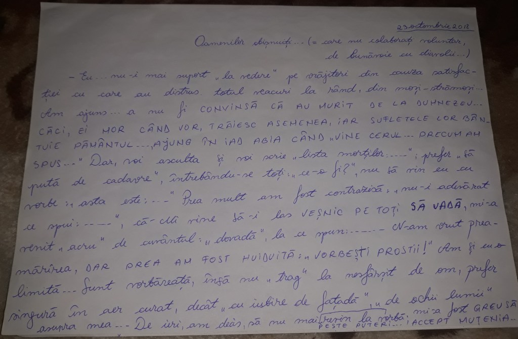 – I… cannot stand to see the sorcerers anymore because of the satisfaction they destroyed everything for centuries, for generations… I got to the point… of not being CONVINCED THAT THEY DIED FROM GOD… BECAUSE THEY DIE WHENEVER THEY WANT, LIVE LIKEWISE, AND THEIR SOULS HAUNT THE EARTH… THEY GO TO HELL ONLY WHEN “HEAVEN COMES… AS I SAID BEFORE…” But, I will listen and I will write The list of the dead; I prefer to “stink of dead bodies”, all asking: “What is that about?”, not for me to come with words: “This is about: ______”. To much time I’ve been contradicted: “It is not true the things you say: ______”, because I feel to let ALL FOREVER TO SEE FOR THEMSELVES, I’m fed up of the word proof at what I say: ______. I did not searched for glorification, BUT TO MUCH I’VE BEEN HOOTED: “YOU TALK NONSENSE!”. I have a limit too… I’m chatty, but I do not drag somebody endlessly, I prefer alone in fresh air, then with “facade love”, “for show” above me… Of yesterday I decided not to restart talking BEYOND ENDURANCE… It was HARD FOR ME TO ACCEPT THE MUTENESS…