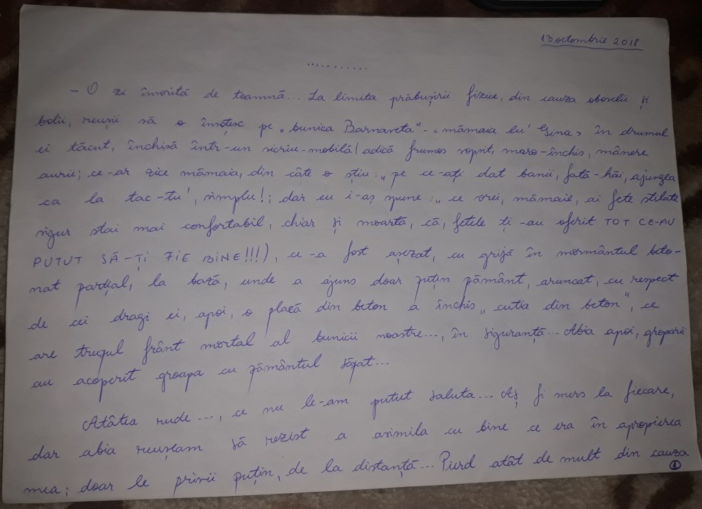 – A sunny autumn’s day… At the edge of the physical collapse from exhaustion and illness, I managed to go with granny Barnaveta (Gina’s granny) on her quiet way, in a closed coffin – like a furniture (meaning beautifully varnished, dark brown, golden handles; what granny would say if I know her: “On what have you spent your money on, it was enough one like your father had, simple!”, but I would say to her: “What do you want granny, you have stylish girls, you are more comfortable like this for sure even dead, because the daughters offered you THE BEST THEY COULD FOR YOU TO BE WELL, which was placed with care at the base of the partially sealed with cement grave, where only a little ground got there, thrown with respect by her beloved ones and after, a concrete slab closed the concrete box, which hold the broken to death body of our grandmother… safely… Only then, the gravediggers covered the hole with the dug ground…