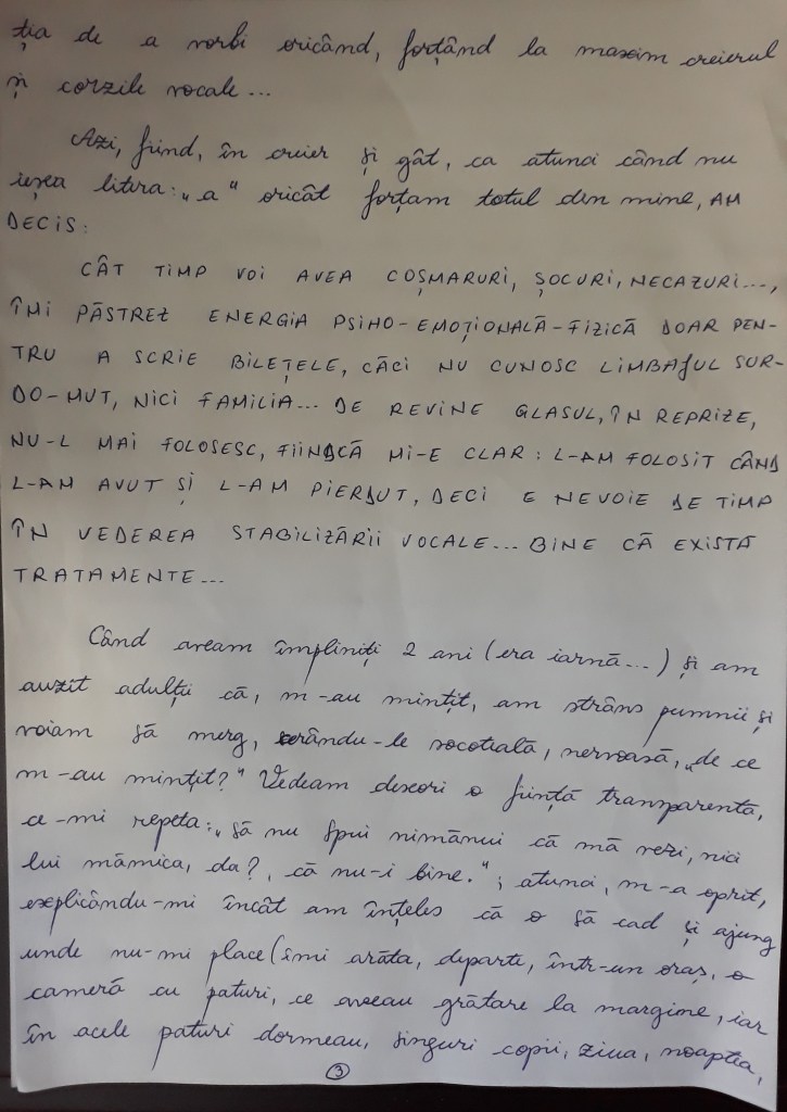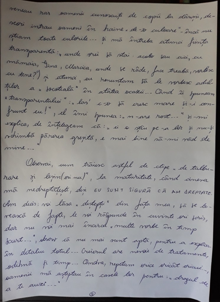 Thanks to the lady pharmacist from Plafar (I do not know her, I wrote tickets; my mother knows her…), the one that believed me that “I cannot because of the nightmares, maybe there’s a herbal treatment…” and that my muteness problem is real, not just a psychological issue, of determination, vitamins, faith… my everyday voice has return, but belated (very late) because my body is drained to maximum of psycho-emotional energy, has constant cerebral tiredness, because of the sleep destruction, and when I’m awake I get hit of the destructive reality… This way, the moments of muteness alternated with the ones when talking… I felt everyday how I lose verbal energy, but the family circumstances, social circumstances, got me in the situation of talking anytime, forcing at maximum my brain and my vocal cords…