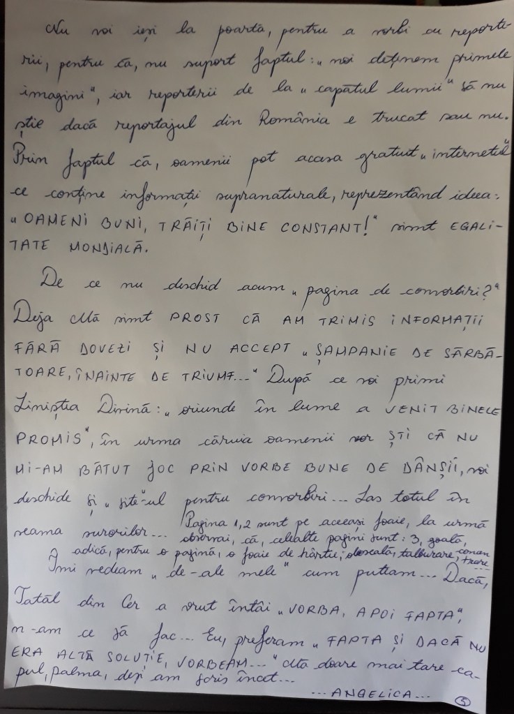 I will not come out to my door to talk to reporters because I cannot stand the fact: “We have the first pictures”, and the reporters from “the other site of the world” not knowing if the report from Romania is a fake or not. By the fact that people have free Internet access to supernatural information, staying the idea: “GOOD PEOPLE, LIVE WELL CONSTANTLY!”. I feel WORLDWIDE EQUALITY.