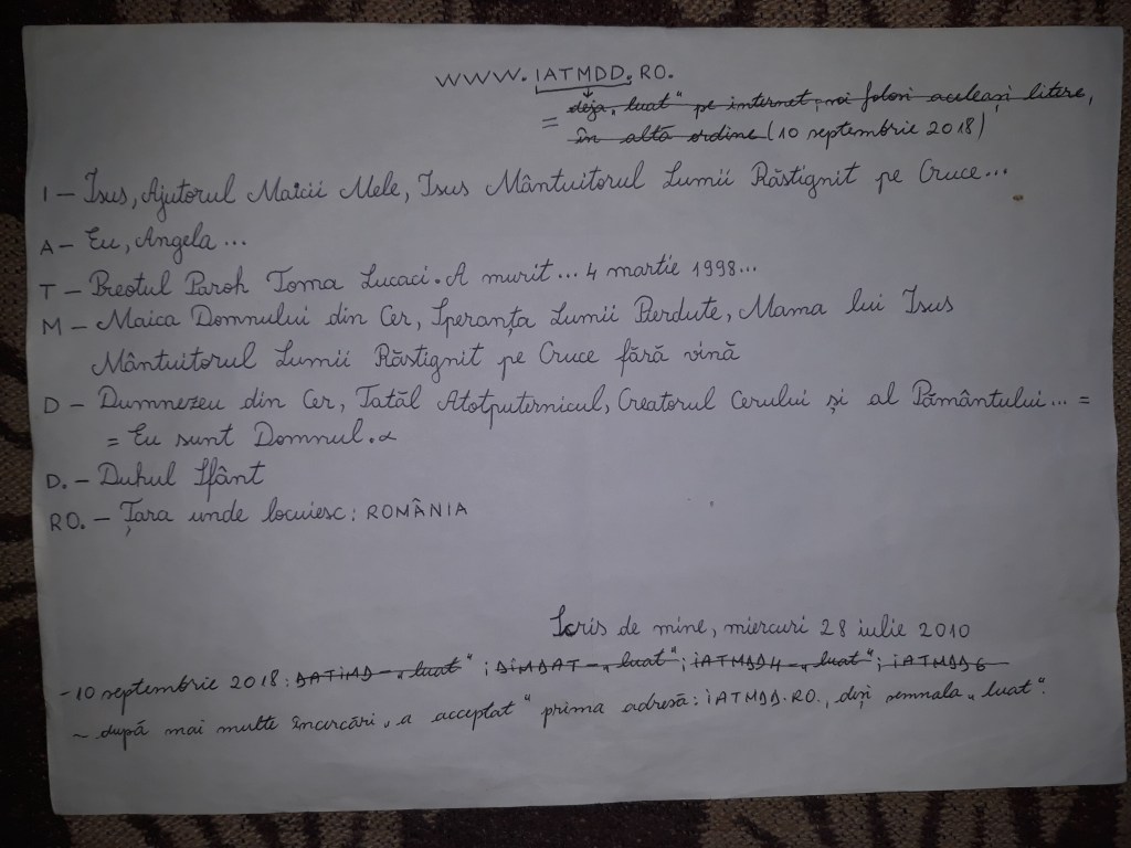 [Note: The website iatmdd.ro was published on September 10, 2018. Five days later, on September 15th, was followed by iatmdd.com, which was initially intended to contain the same information as iatmdd.ro translated in English. However, as previously mentioned, the last update on iatmdd.ro was made on January 28th, 2019, and iatmdd.com replaced it as the main source of information, that is until June 2nd, 2021, as mentioned in homepage. All changes were and will be made at the specific request of the Persons from Heaven. Valentina]