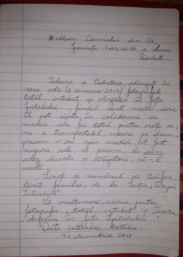 Iuliana and Valentina, add tonight (January 6th, 2018) the photographs: father intubated and Angelica in front of the hospital… because there are doctors that can help him together with the doctors that already do everything for his life; he’s not transportable, dies on the road, as the doctors told you. It was the only way: to watch at the manner the devils and sorcerers chose to kill him…